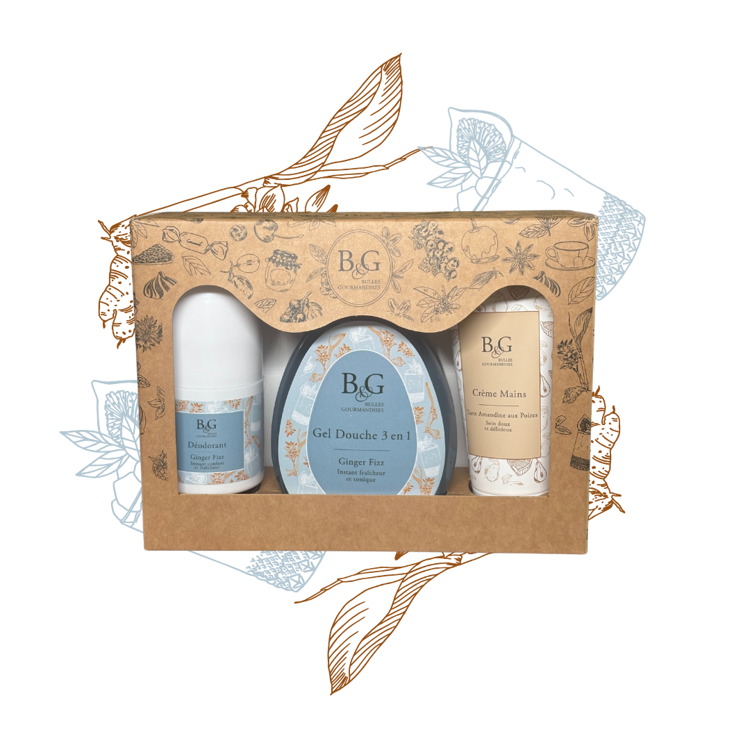 Produits: Déodorant Ginger Fizz (50ml), Gel douche Ginger Fizz (200ml), Crème Mains Tarte Amandine aux Poires (50ml)