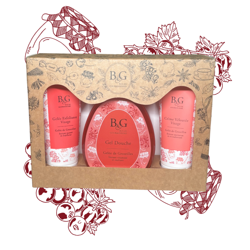 Produits: Gelée exfoliante (75ml), Gel douche Gelée de Groseilles (200ml), Crème veloutée (75ml)